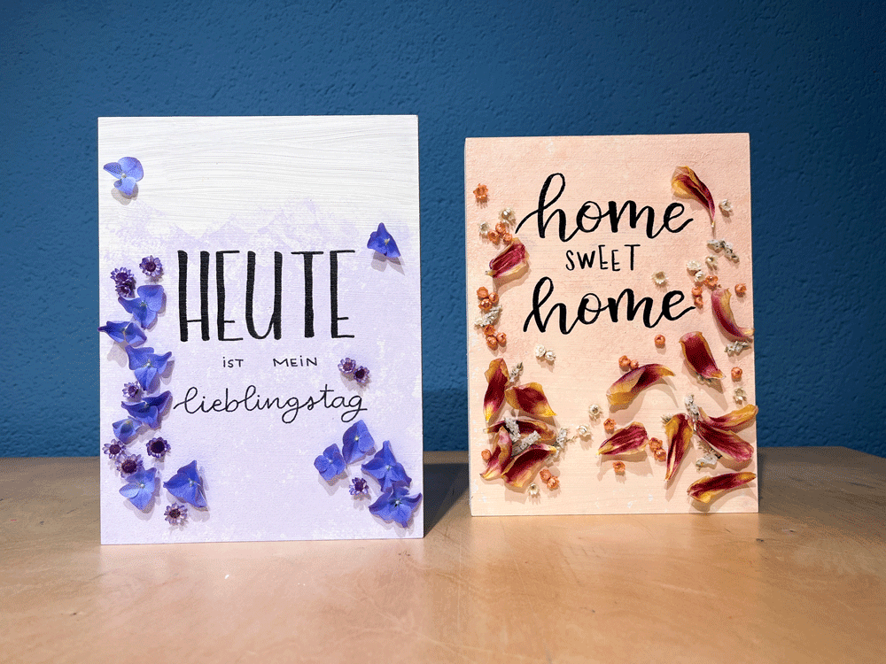 Das Highlight: In Zusammenarbeit mit der Floristin Maria Bernadette Hauser veredeln wir unsere Werke mit liebevoll ausgewählten Blumen. So entsteht ein einzigartiges Zusammenspiel aus Schrift und Natur – ein dekoratives Wandstück, das Wärme, Persönlichkeit und Handwerk vereint.