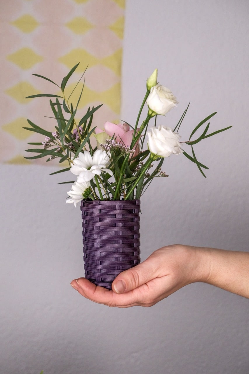 Dieser Workshop verbindet Flechttechnik mit floraler Gestaltung. Zuerst entsteht ein handgeflochtener Korb aus Paperband, anschließend wird er mit einem farbenfrohen Blumengesteck gefüllt.