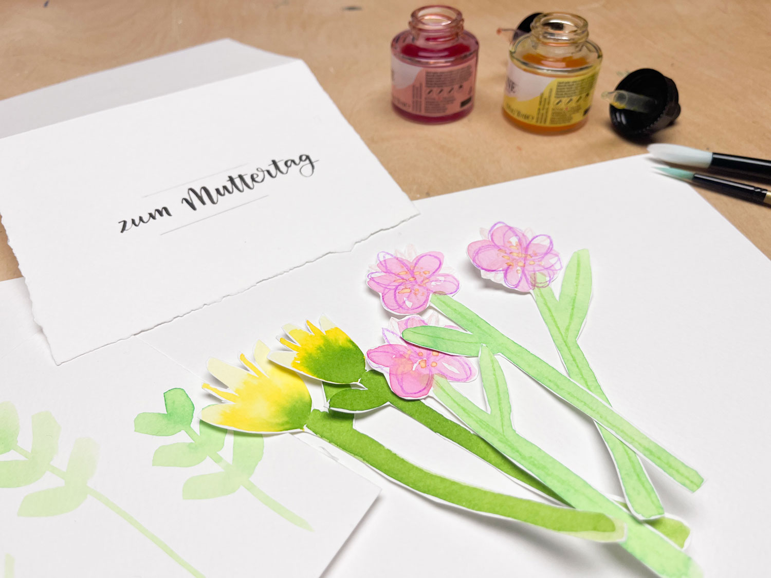 Male, schneide, kombiniere: Aus Aquarellblumen entsteht ein kleiner Strauß auf Papier – als persönliche Muttertagskarte zum Verschenken.